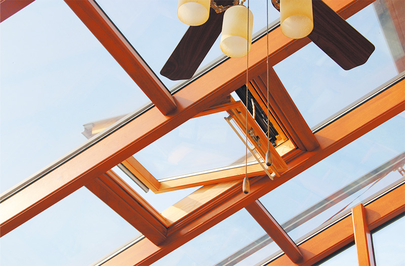 D210鋁包木陽光房使用斜屋頂天窗,解決了夏天太熱的問題,當(dāng)陽光房頂上的天窗打開后,熱氣往上跑出天窗,陽光房外的低溫空氣補(bǔ)充,形成空氣對(duì)起到降溫。陽光房天窗,既通風(fēng)又不影響采光,使陽光房感覺寬闊、明亮、高雅,生動(dòng)靚麗,是陽光房的畫龍點(diǎn)睛般不可缺少的。